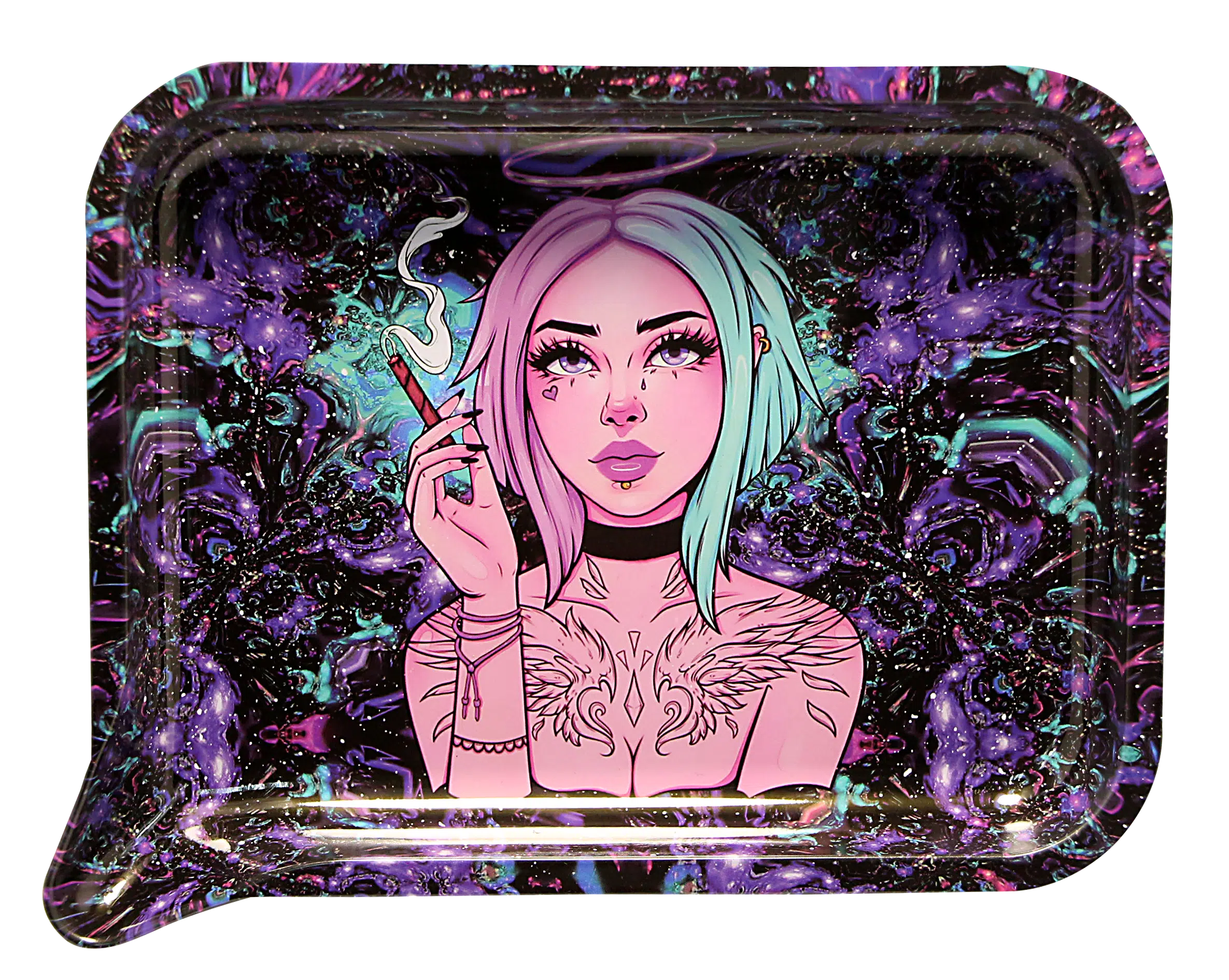 FRT3D-052 Get Lost Medium Funnel Rolling Tray with 3D Magnetic Lid (Get Lost Pink Hair Angel Smoking)
